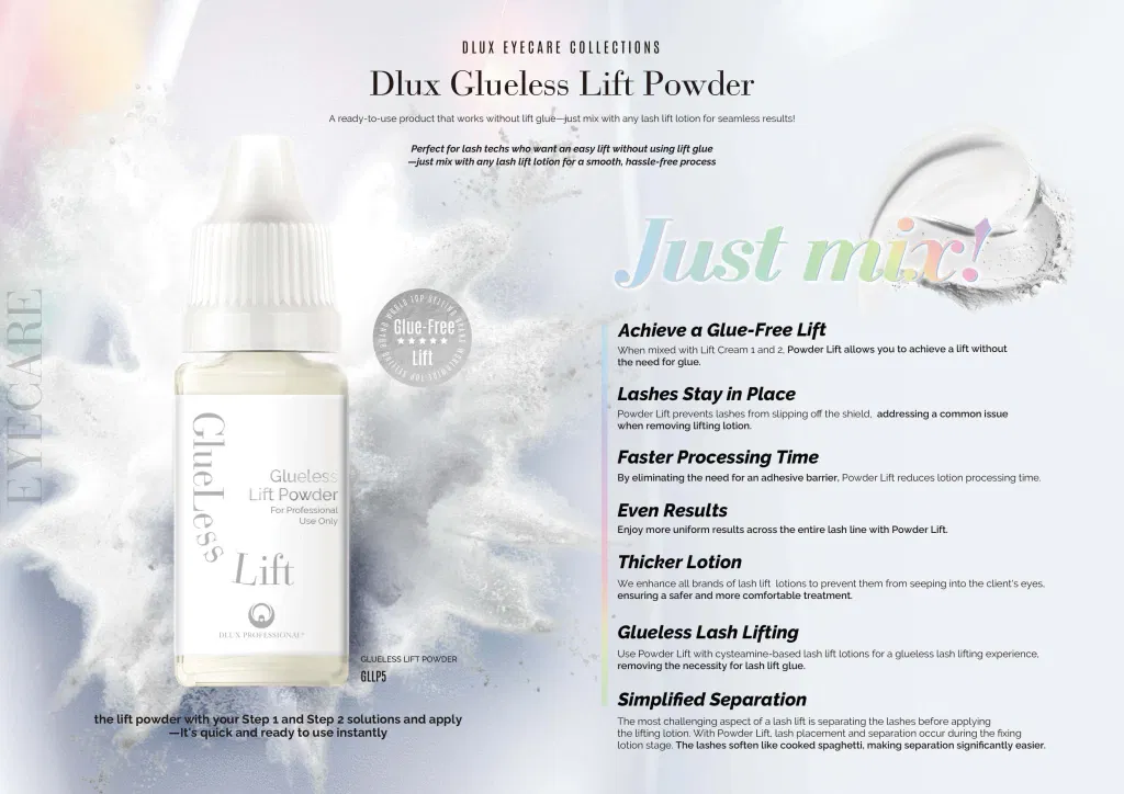 El Glueless Powder de DLUX es la alternativa innovadora al pegamento tradicional en lifting de pestañas.